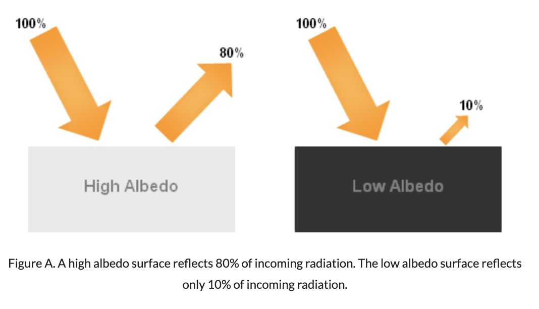 A high albedo means the surface reflects the majority of the radiation that hits it and absorbs the rest. A low albedo means a surface reflects a small amount of the incoming radiation and absorbs the rest.