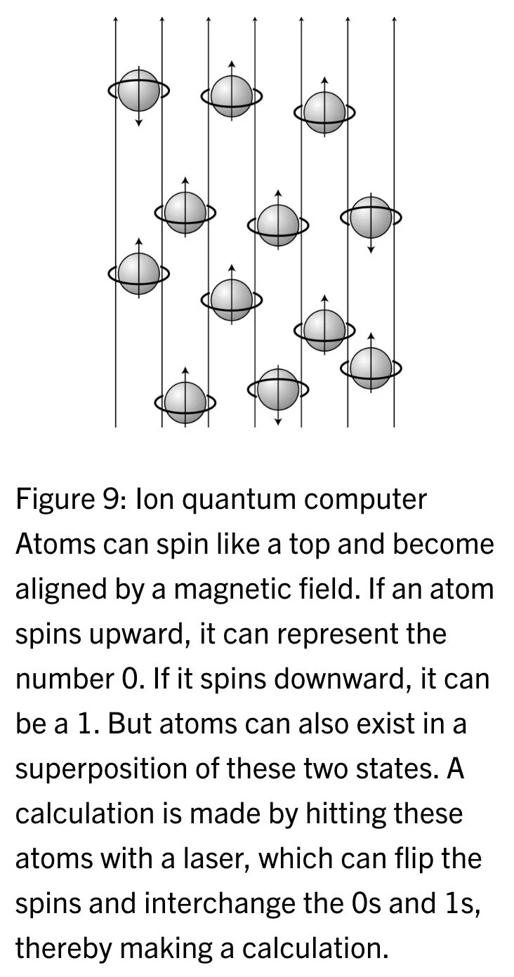 Ion Trap Quantum Computer: A type of quantum computer that suspends an ion in a trap that consists of a series of electric and magnetic fields, and when multiple ions are introduced, they vibrate as coherent qubits. For example, if the electron axis spins up, then the state is a 0. If it spins down, it is a 1. So the result is a superimposed mixture of two states. Then microwave or laser beams can hit these ions, flipping them and causing them to change state. So these beams act like a processor, turning one configuration of atoms into another, just as a CPU in a digital computer flips transistors between on and off states.