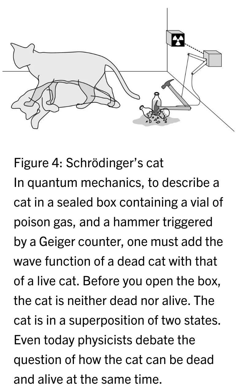 Imagine, Schrodinger wrote, there is a cat in a sealed box, which contains a vial of poison gas. This vial is connected to a hammer, which is attached to a Geiger counter next to a quantity of uranium. If an atom of the uranium decays, it activates the Geiger counter, which sets off the hammer, thus releasing the poison and killing the cat. Now here is the question that has baffled the world’s top physicists for the past century: Before you open the box, is the cat dead or alive? A Newtonian would say that the answer is obvious: common sense says that the cat is either dead or alive, but not both. You can only be in one state at a time. Even before you opened the box, the cat’s fate was already predetermined…However, Werner Heisenberg and Niels Bohr had a radically different interpretation. They said that the cat is best represented by the sum of two waves: the wave of the live cat and the dead cat. When the box is still sealed, the cat can only exist as the superposition or sum of two waves simultaneously representing a dead and a live cat.